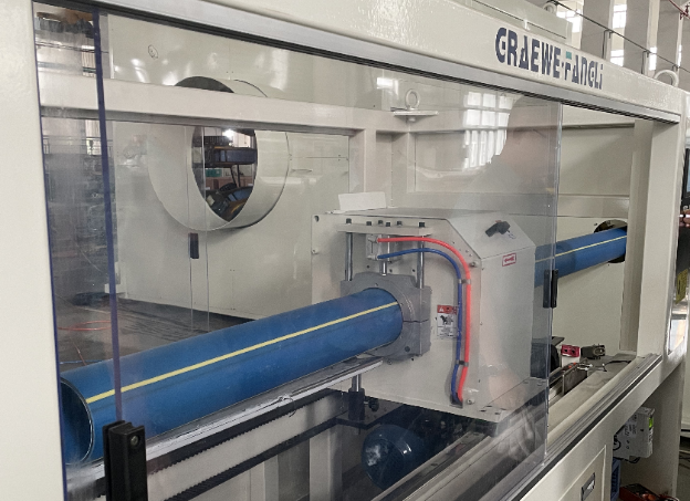 Keempat, pipa diangkut oleh unit traksi ulat dan dikirim ke pemotong dimana pipa dipotong sesuai dengan panjang yang telah ditentukan; pada saat yang sama, debu pemotongan dihilangkan dengan penghilang debu.